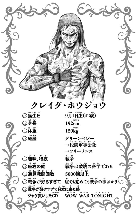 - 身長192㎝で体重120㎏。体格は相当よく、趣味も特技も戦争の戦争大好きキャラ。